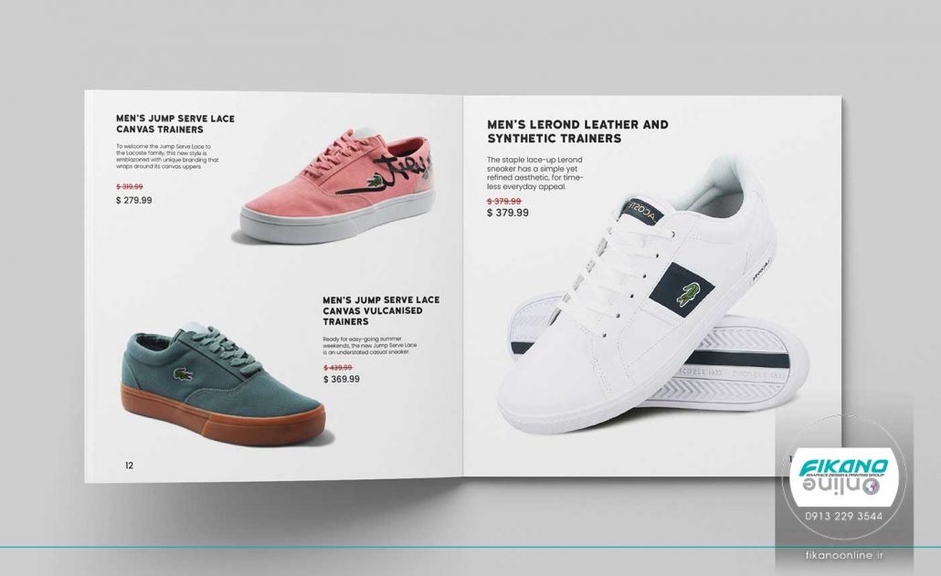 کاتالوگ محصولات از کاربردی ترین دسته بندی های محصولات چاپی می باشد. تصویری از کاتالوگ محصول (کفش) لاگوست، این برند شناخته شده را می بینید، کاتالوگ بصورت مربع طراحی شده است و تصاویری بزرگ محصول را به نمایش گذاشته اند.