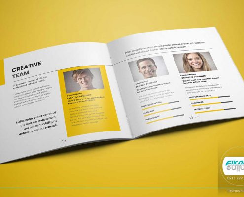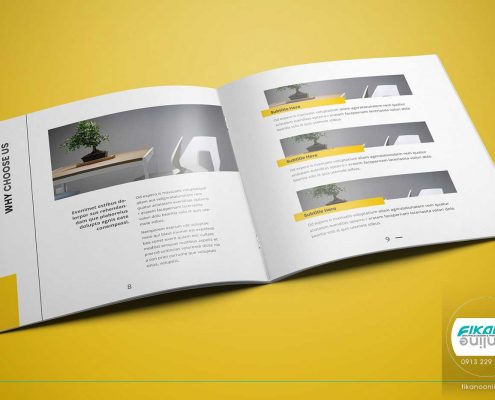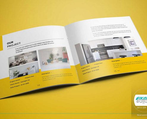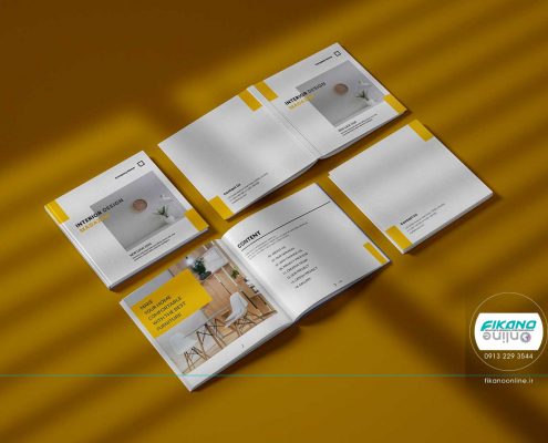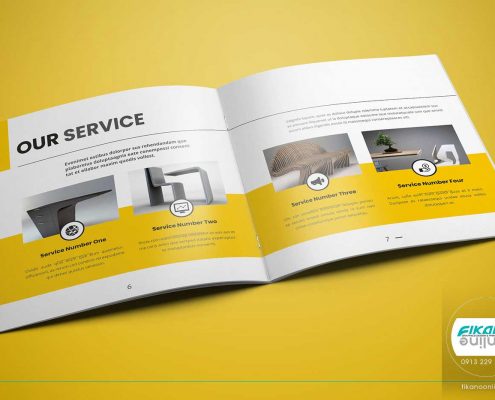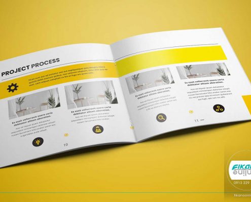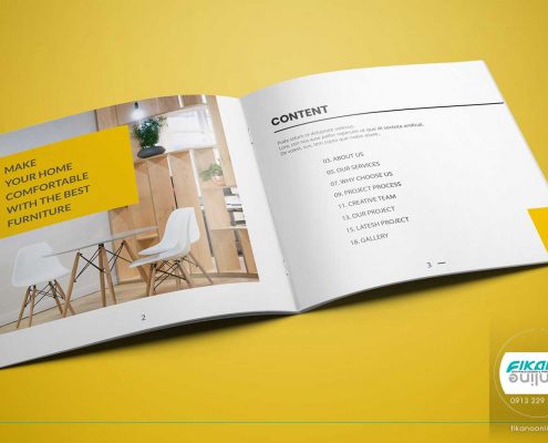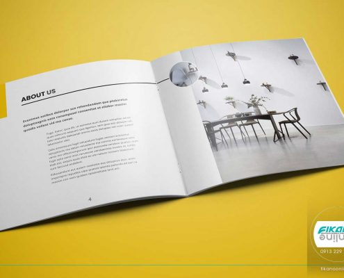 نمونه پیش رو ایده ای مینیمال و زیبا برای طراحی کاتالوگ برای محصولات و مبلمان می باشد که با رنگ زمینه سفید و زرد طراحی شده است. کاتالوگ سطح های رنگی  مستطیل شکل و تصاویر گالری مانند بدون قاب و چهار گوشی دارد که سادگی و زیبایی طراحی را بوجود آورده است. کاتالوگ فونتی مینیمال دارد و این موضوع زیبایی طراحی را افزون کرده است. صفحه بندی و دیزاین تصاویر با چیدمان های  متنوع در صفحات مختلف انجام شده است تا تنوع طرح در کنار برخود هماهنگ و بدور از زیاده گویی در طراحی، حفظ شود.