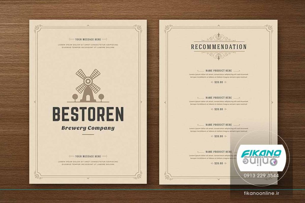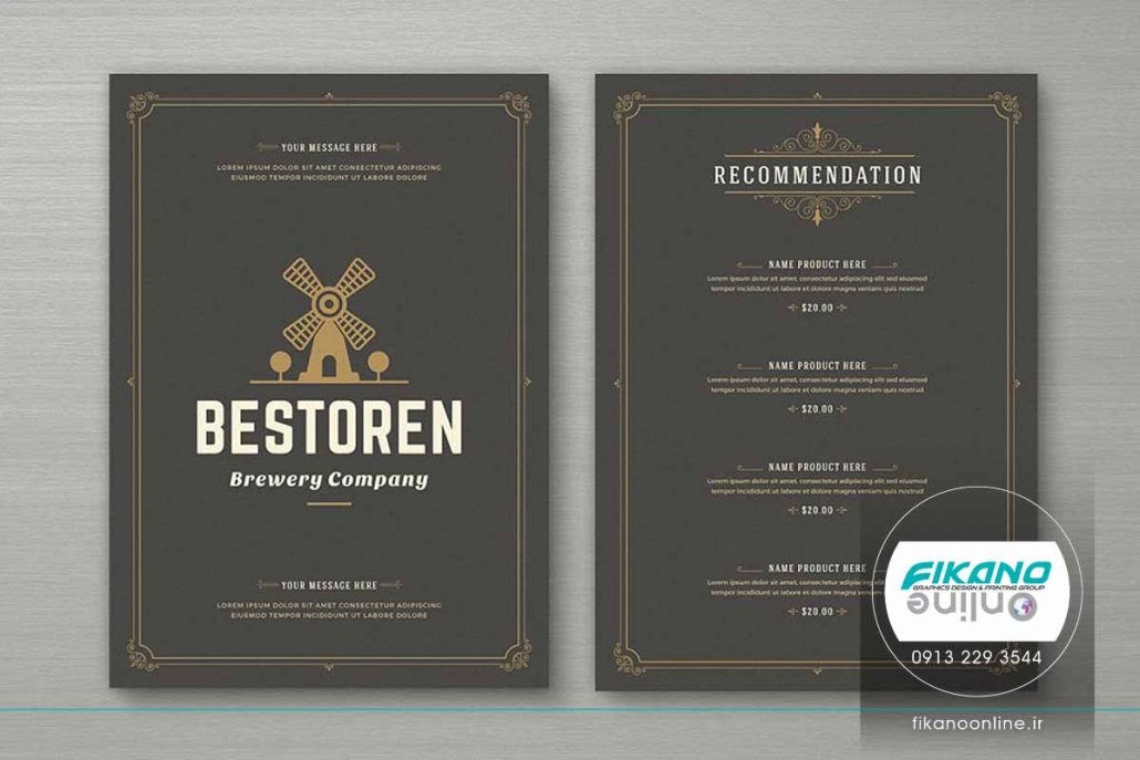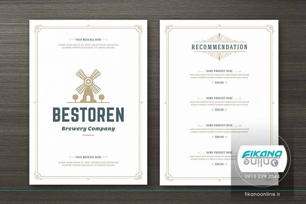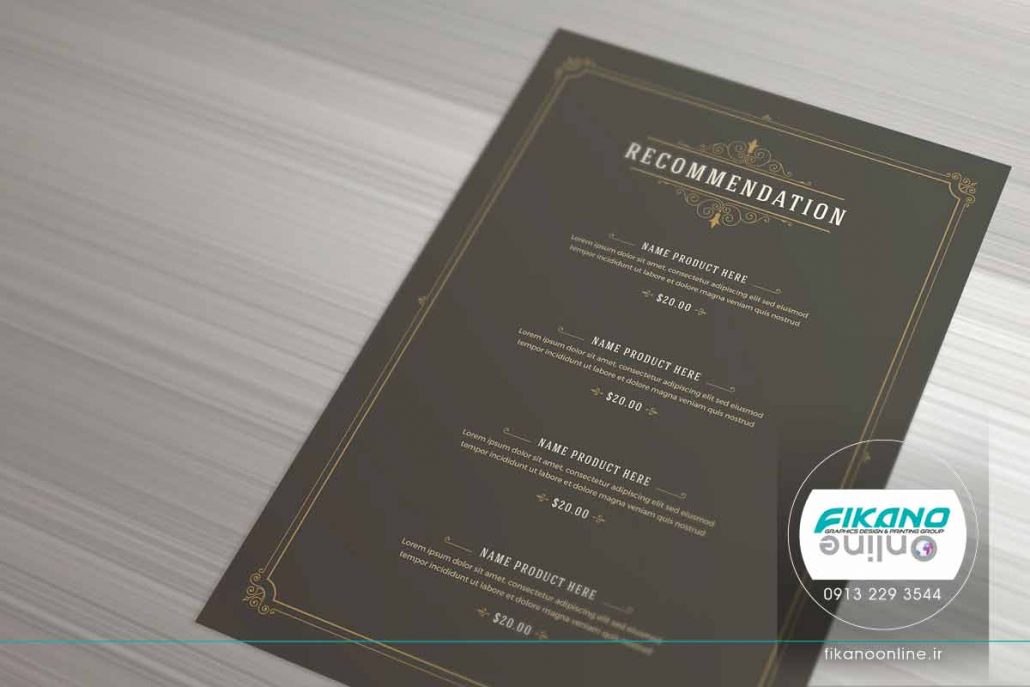 در منو از حداقل رنگ استفاده شده است، البته رنگ های مناسب و هماهنگ دیگری هم برای طراحی این منو قابل استفاده است.
