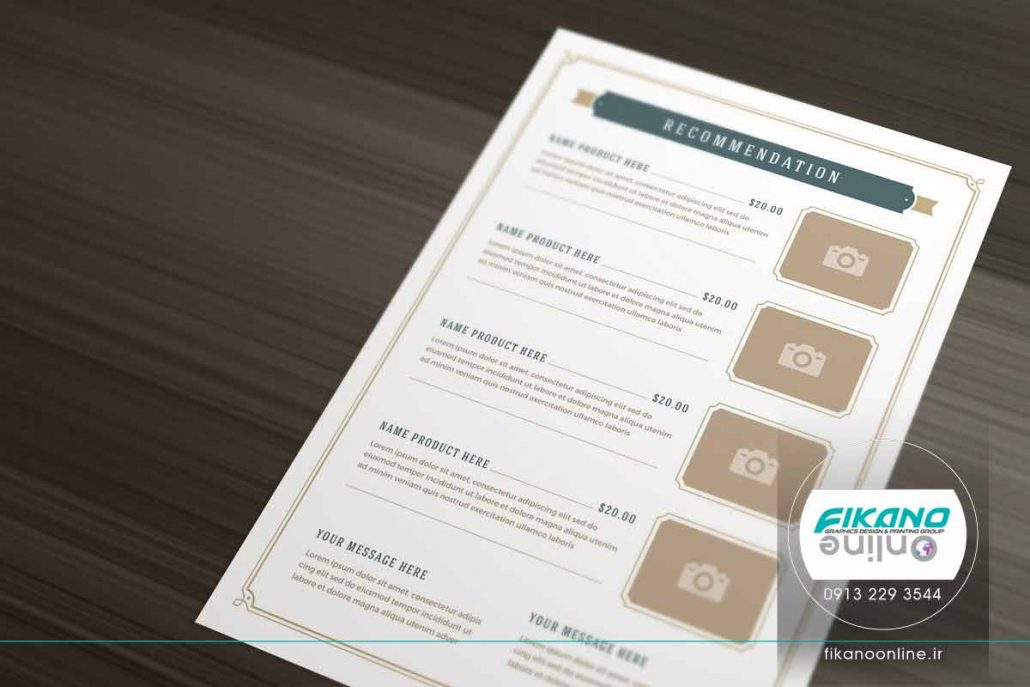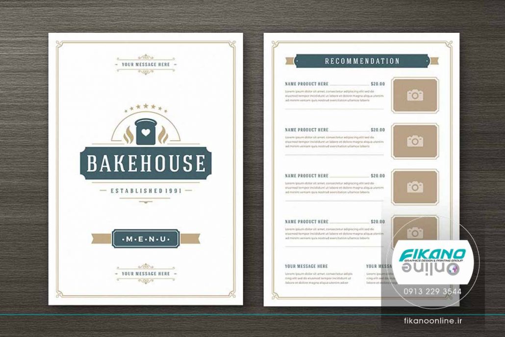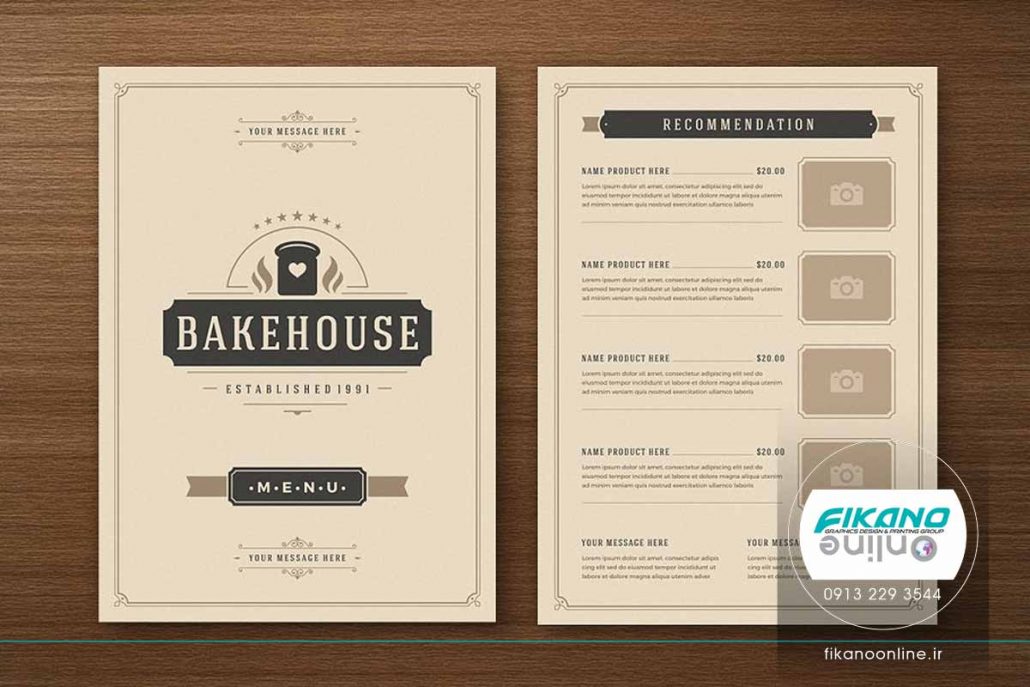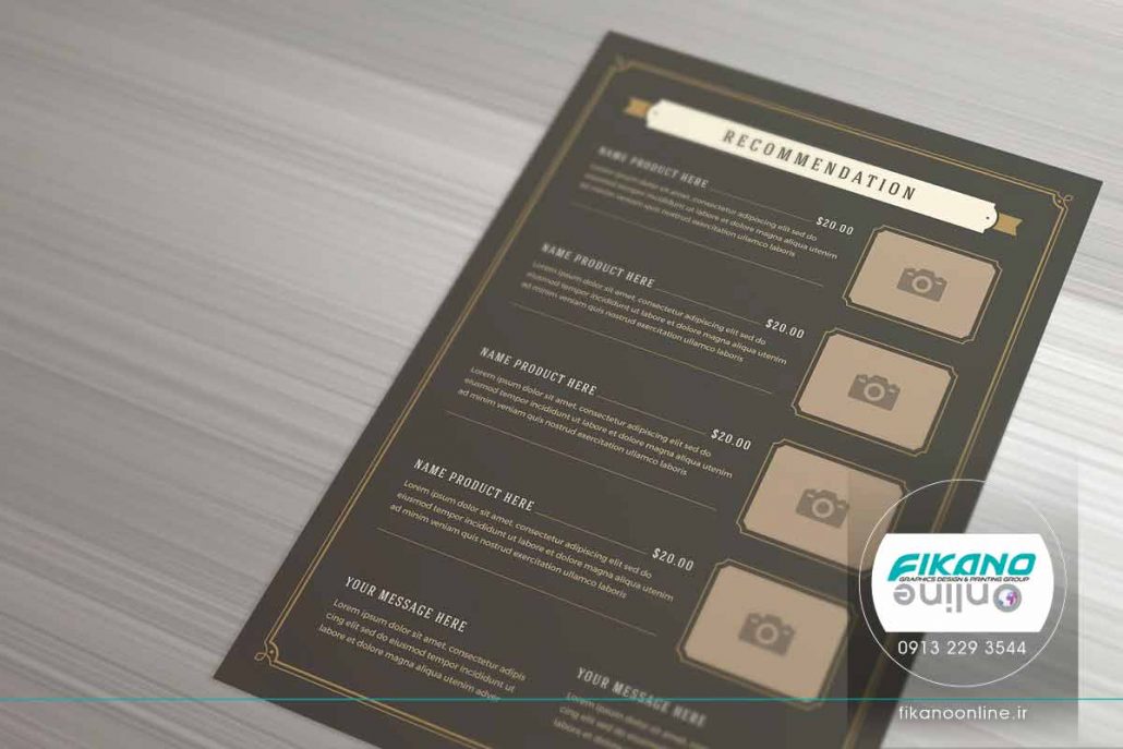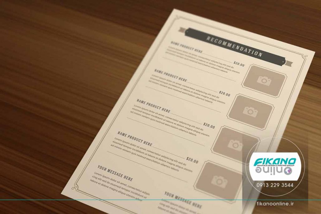 منو، فضای کافی برای نوشتن نام و جزئیات غذا را دارد، همچنین فضایی هم برای قرار دادن تصویر غذا در نظر گرفته شده است.