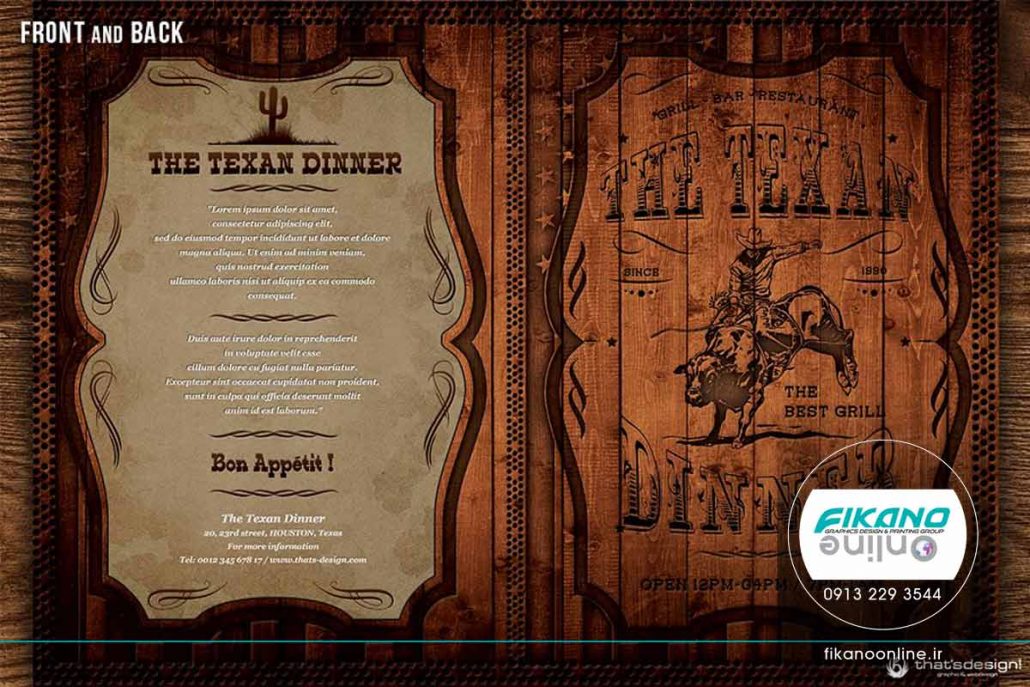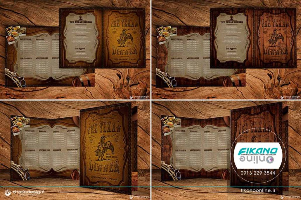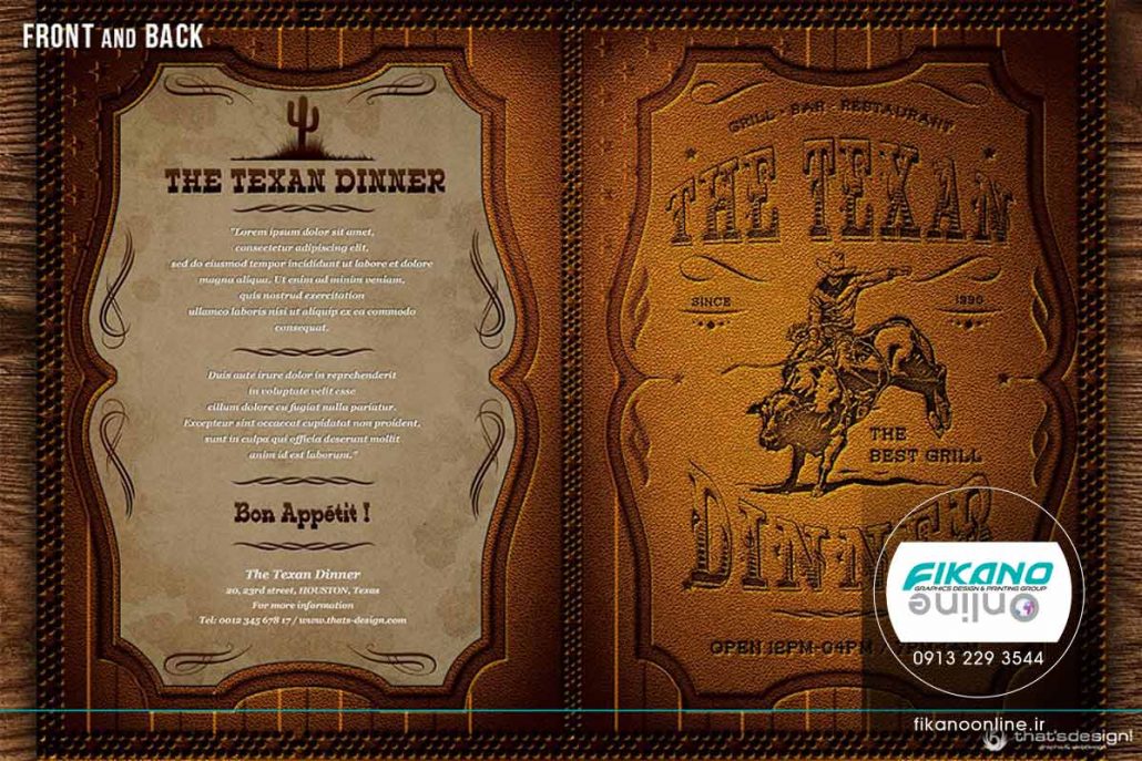منو طرح چرم پیش رو را علاوه بر چاپ افست یا دیجیتال بر روی مقوا، می توان به صورت واقعی و بر روی چرم بصورت داغکوب اجرا کرد.