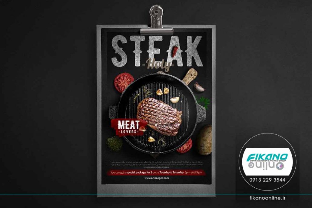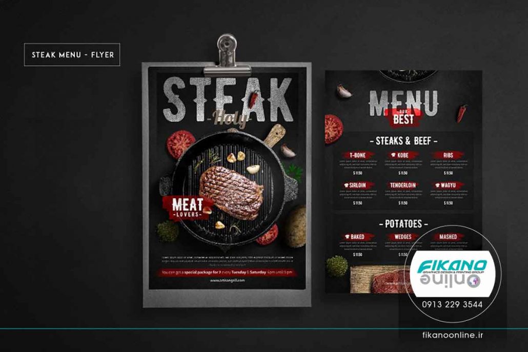 منو بسیار چشمگیر و خاص است. این طراحی، فضای مناسبی برای نام غذا و جزئیات دارد و همچنین می توانید از تعدادی تصویر غذا در منو استفاده کنید.